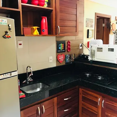 Melhore a sua estadia com a cozinha equipada de apartamento Paraíso em Flecheiras, equipada com máquina de café/chá, refrigerador e utensílios de cozinha para seu conforto.